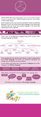 This exhibit introduces viewers to Cree, the most widely spoken Canadian Indigenous language. Six colourful panels present maps, photos, and information on topics including the syllabic writing system, word formation, animacy, and the future of Cree. There are also audio clips of Cree dialects from across Canada.